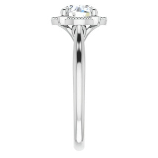 This stunning cathedral engagement ring boasts a classic halo design with milgrain accents that create a timeless and elegant aesthetic. The plain bands of the setting perfectly showcase the round accents, which are lightly set within the halo and milgrain detailing.