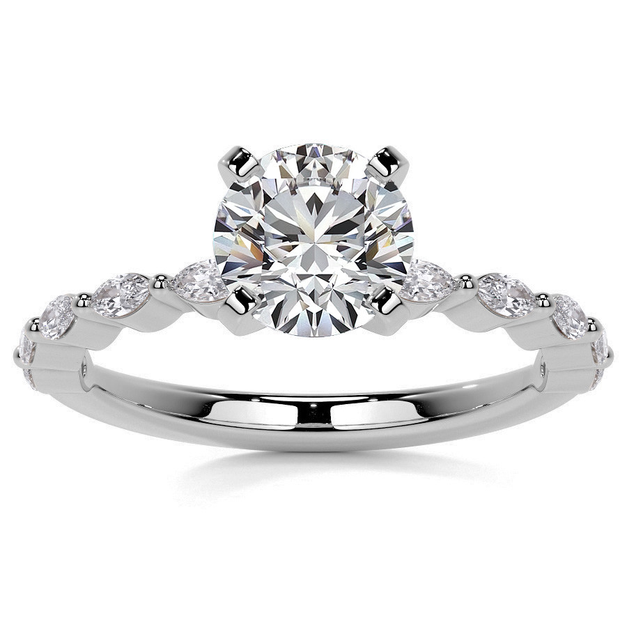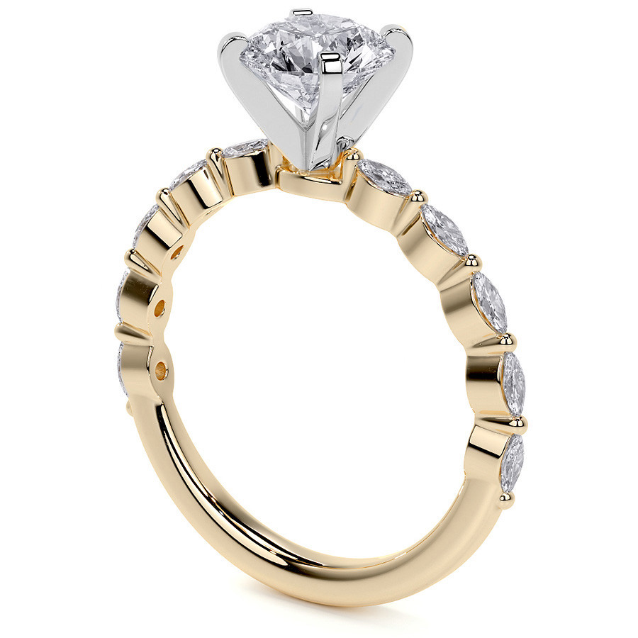 At its core, this captivating ring showcases a singular prong design, a testament to its minimalist beauty. Accentuating the center stage is a radiant array of ten 3x1.5mm marquise-cut VS/E diamonds, each boasting a 0.04ct weight, resulting in a combined total carat weight of 0.40tcw. This ensemble of diamonds adds a brilliant symphony of sparkle and sophistication to your cherished piece.