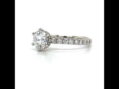 At the heart of this masterpiece lies a round brilliant lab grown diamond center stone, available in the size and quality of your preference. This dazzling gem is expertly secured with six delicate prongs, gracefully perched atop the peak of the cathedral setting, ensuring that it commands attention from every angle.