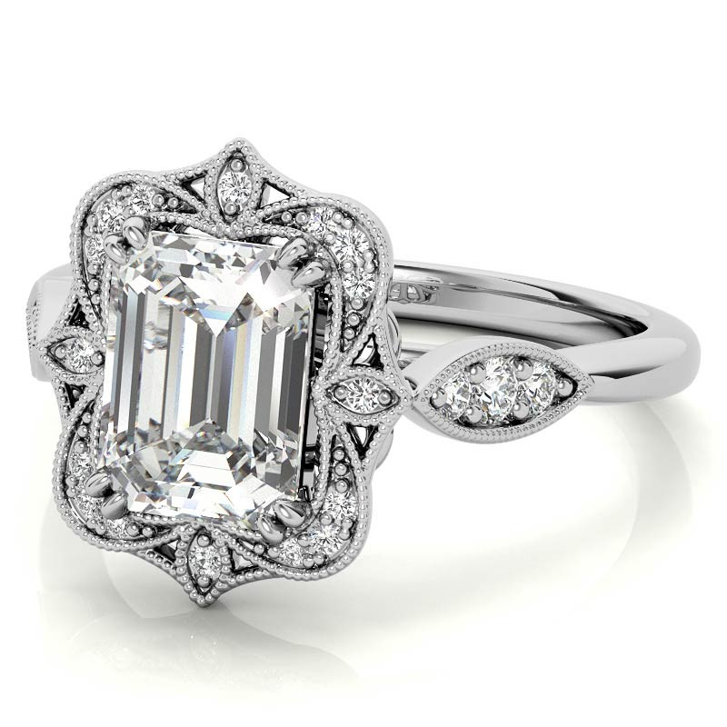 This exquisite engagement ring boasts a timeless vintage halo design encircling an emerald or radiant cut lab grown diamond center stone, delicately held in place by four sets of petite double prongs. The band features a stunning petal shape detail at the top of the cathedral, gracefully supporting the halo, and adorned with intricate milgrain accents that wrap around the petals and the cathedral design.