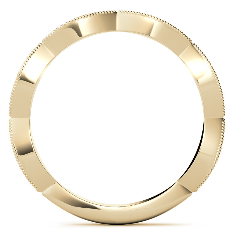 The band width measures approximately 2mm at the base of the ring, and an optional 0.17ct matching band with scalloped design and milgrain accents is also available to complete the set.