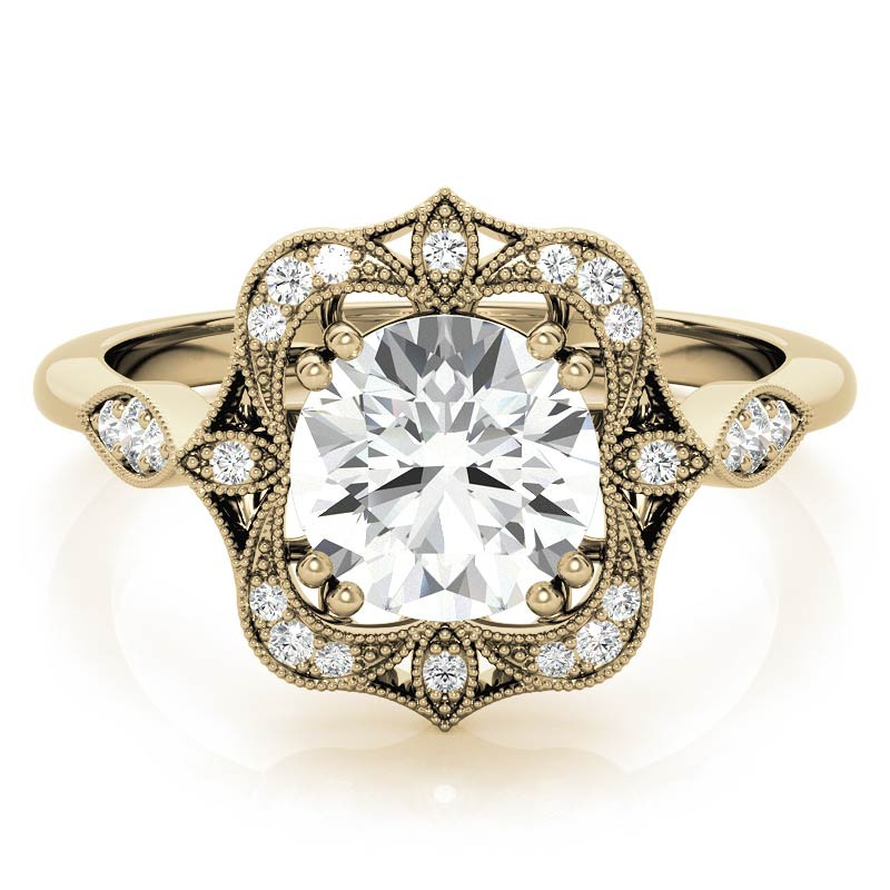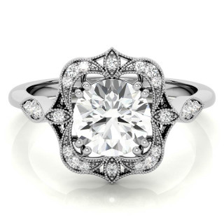This exquisite engagement ring boasts a timeless vintage halo design encircling a round brilliant lab grown diamond center stone, delicately held in place by four sets of petite double prongs. The band features a stunning petal shape detail at the top of the cathedral, gracefully supporting the halo, and adorned with intricate milgrain accents that wrap around the petals and the cathedral design.