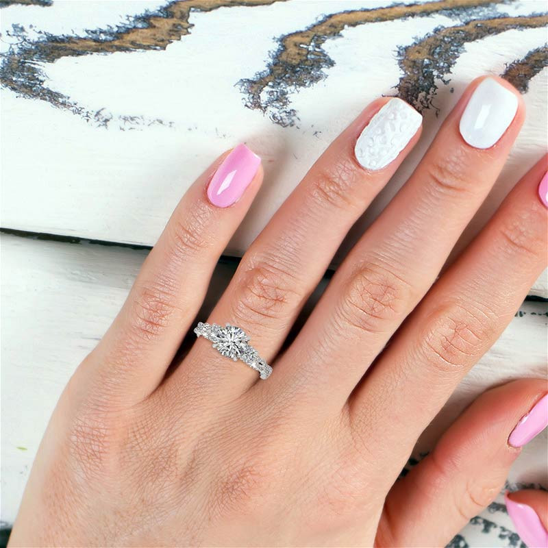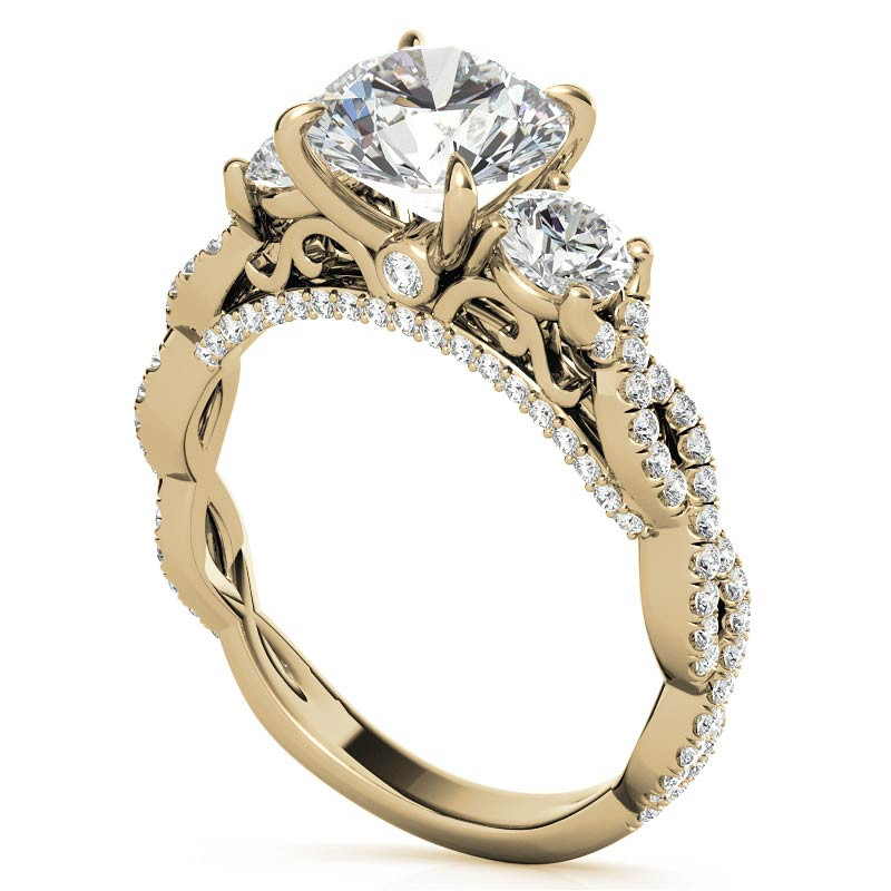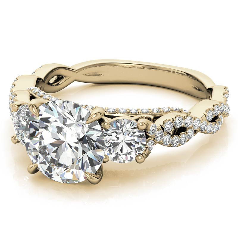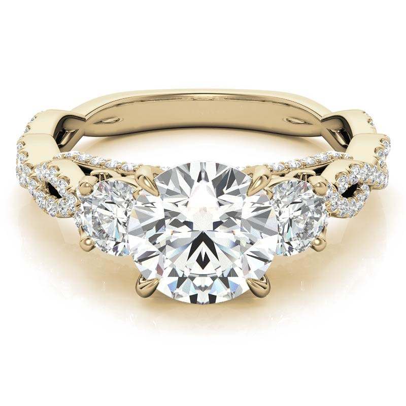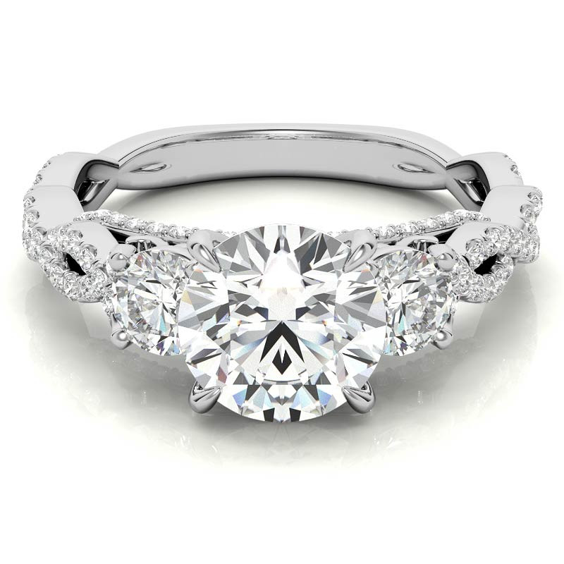 At the heart of this magnificent piece is a round brilliant lab grown diamond gemstone, meticulously selected to meet your desires in both size and quality. Framed by two 4mm/0.25ct round brilliant lab grown diamond side stones, the center stone radiates brilliance and grace, captivating all who behold its beauty.