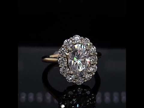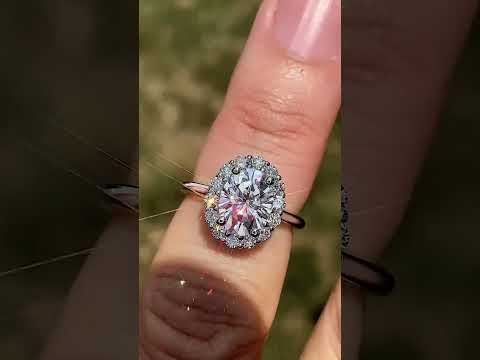 Experience the elegance of this lab grown diamond cathedral engagement ring, featuring a halo design that envelops a stunning oval cut lab grown diamond center stone, delicately placed atop a plain band design.