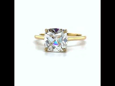 We are excited to present a breathtaking lab grown diamond engagement ring that features a classic cathedral design paired with a refined plain band and a subtly placed halo. The stunning cushion cut center stone is further elevated by the addition of 0.8ct - 0.12cts of colorless lab grown diamond side stones.