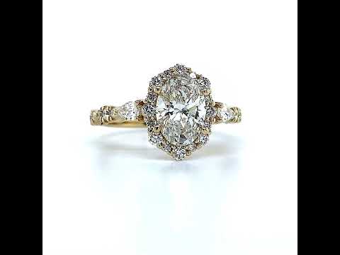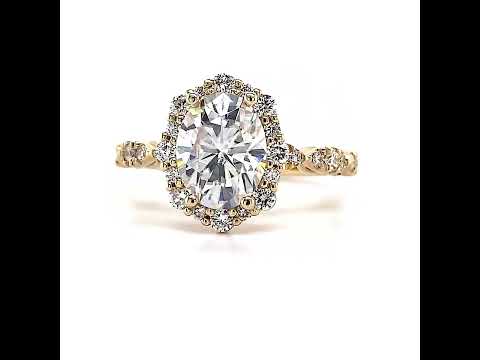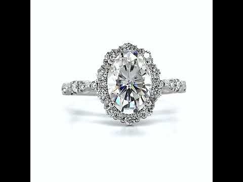 Experience the timeless allure and sophistication of our stunning lab grown diamond engagement ring, featuring a delicate scalloped design and a halo encircling the oval cut center stone, exquisitely crafted to captivate hearts.