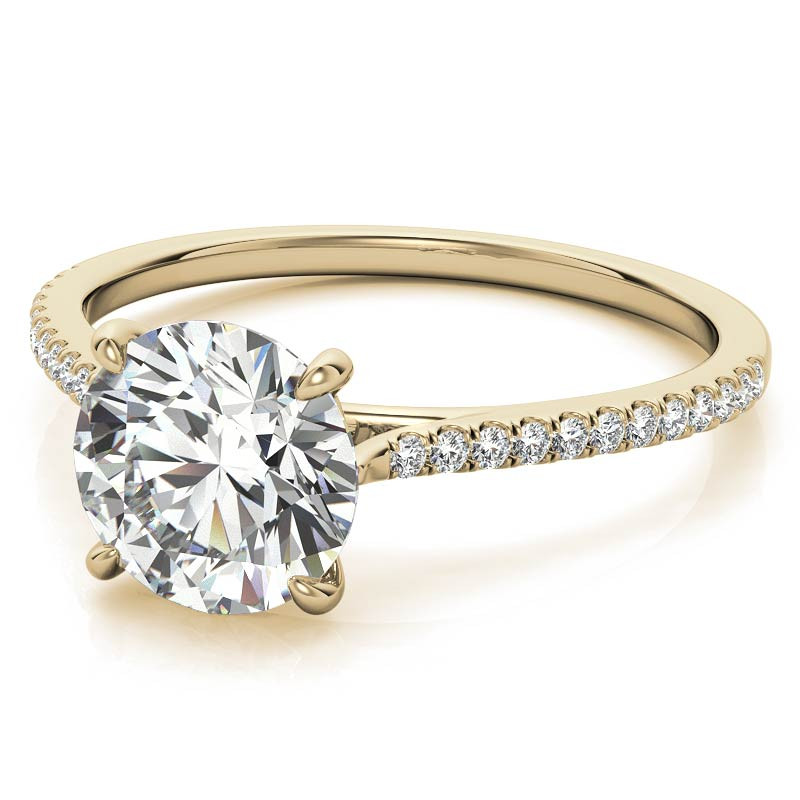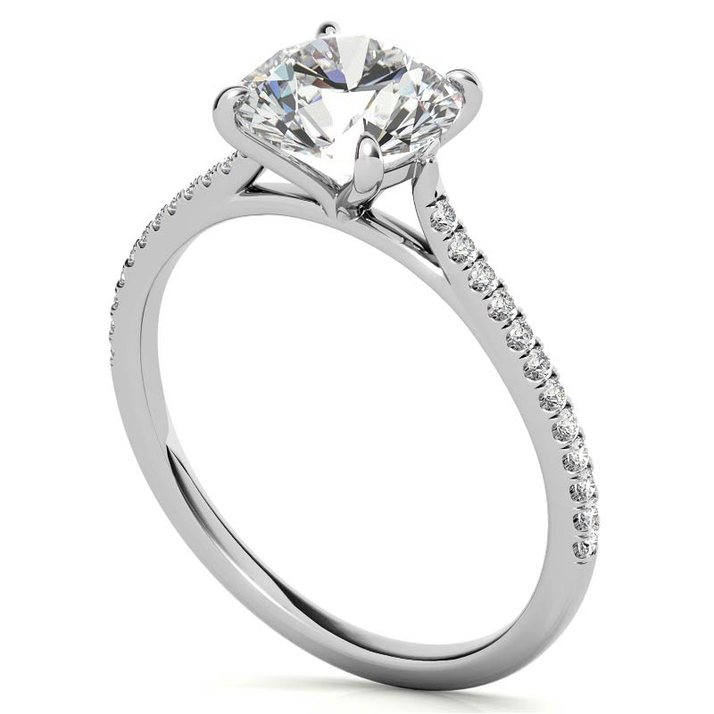 This beautiful lab grown diamond engagement ring features a four-prong design in a cathedral setting, a round colorless lab grown diamond center stone, and 0.12ct of colorless brilliant lab grown diamond side stones. Available in your choice of 14k gold, 18k gold or platinum. The band width is approximately 1.4mm.