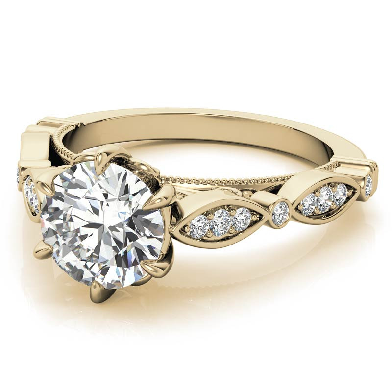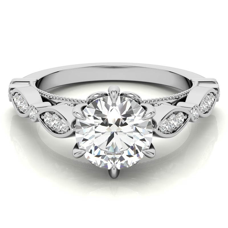 Featuring Side Stones, Scalloped Band, Antique, Cathedral, Scroll and Milgrain from our Engagement Rings collection. Model #enr807 is available in 8 brilliant center stone options, 2 fine sidestone options, and your choice of 6 eco-friendly precious metals.