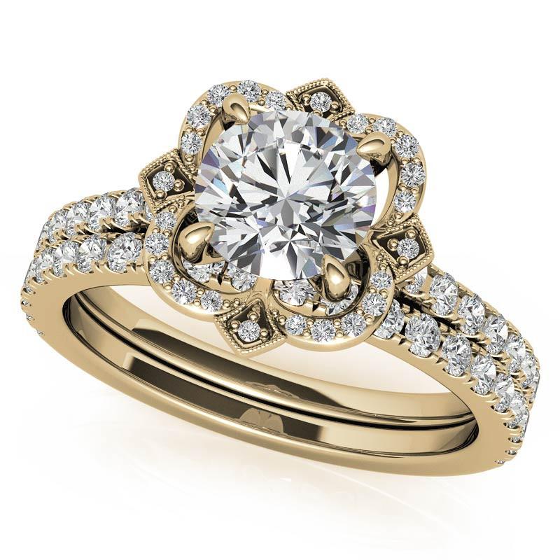 This beautiful lab grown diamond engagement ring features an antique styled halo with milgrain accents, a round colorless lab grown diamond center stone, and 0.35ct of colorless lab grown diamond side stones. Available in your choice of 14k gold, 18k gold or platinum. Add the optional 0.33ct matching band to make this a complete set. The band width is approximately 1.7mm for both rings.