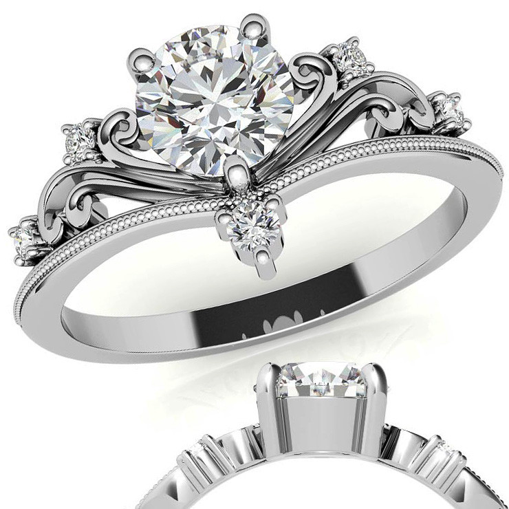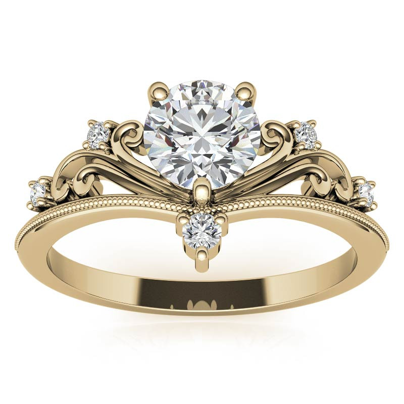 Experience the allure of vintage-inspired design with our exquisite lab grown diamond engagement ring. The stunning antique tiara style is highlighted by intricate milgrain detailing and scroll flourishes, perfectly complementing the round brilliant lab grown diamond center stone.