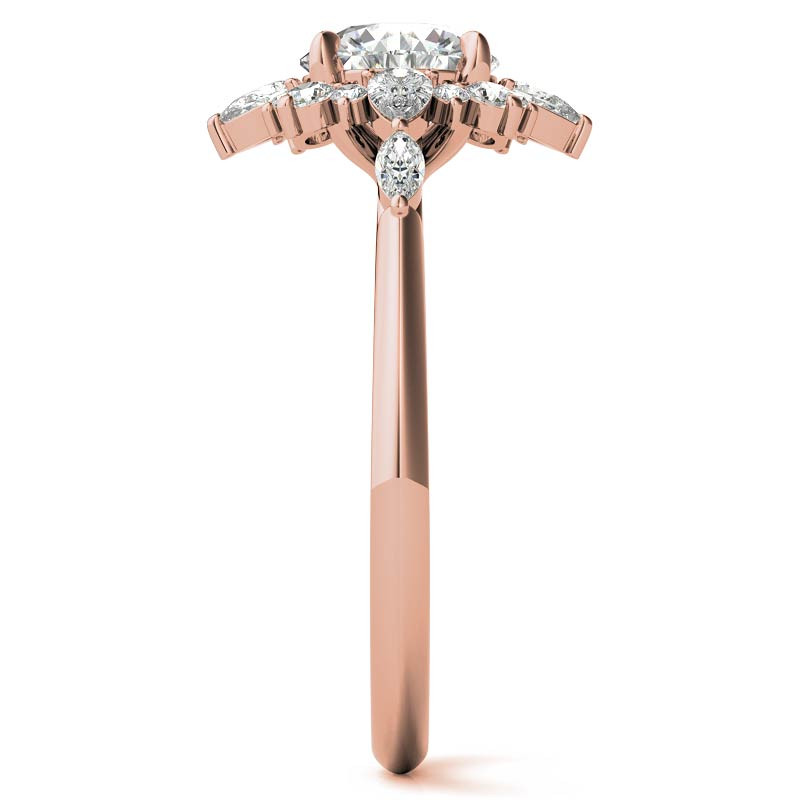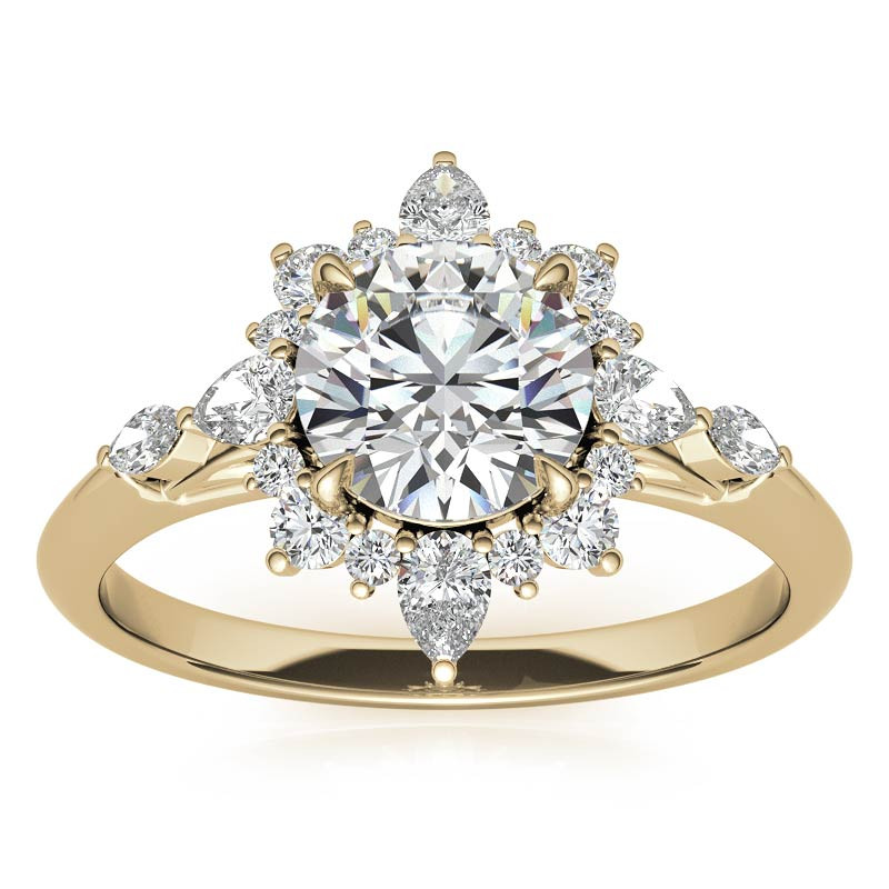 Discover an exquisite symbol of love and commitment with our meticulously crafted lab grown diamond engagement ring. Designed with precision and elegance, this stunning piece showcases a shared prong halo encasing a brilliant round cut colorless lab grown diamond at its heart. Complemented by 3x2mm pear cut and 3x1.5mm marquise cut diamond accent stones, totaling 0.40tcw, and adorned with round VS/E diamond side stones ranging from 0.17ct to 0.24ct, this ring exudes timeless beauty.