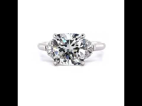 Unveil the enchanting allure of our cathedral engagement ring, an embodiment of grace and elegance. Prepare to be captivated by its three-stone design, tastefully adorned with a plain band. At the heart of this masterpiece lies a cushion cut lab grown diamond center stone, carefully selected in the size and quality that reflects your unique vision. On either side, two 5x3mm half moon lab grown diamond side stones gracefully enhance the ring's radiance.