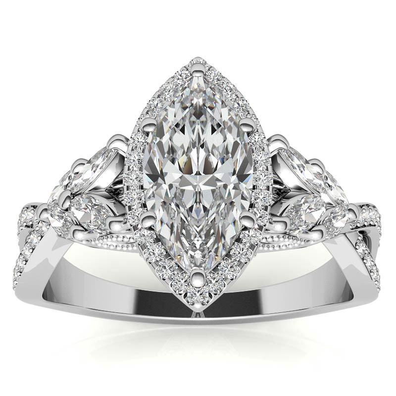 Featuring Side Stones, Halo, Antique, Petite, Cathedral, Scroll, Split Shank and Milgrain from our Engagement Rings collection. Model #enr888-mq is available in 6 brilliant center stone options, 2 fine sidestone options, and your choice of 6 eco-friendly precious metals.