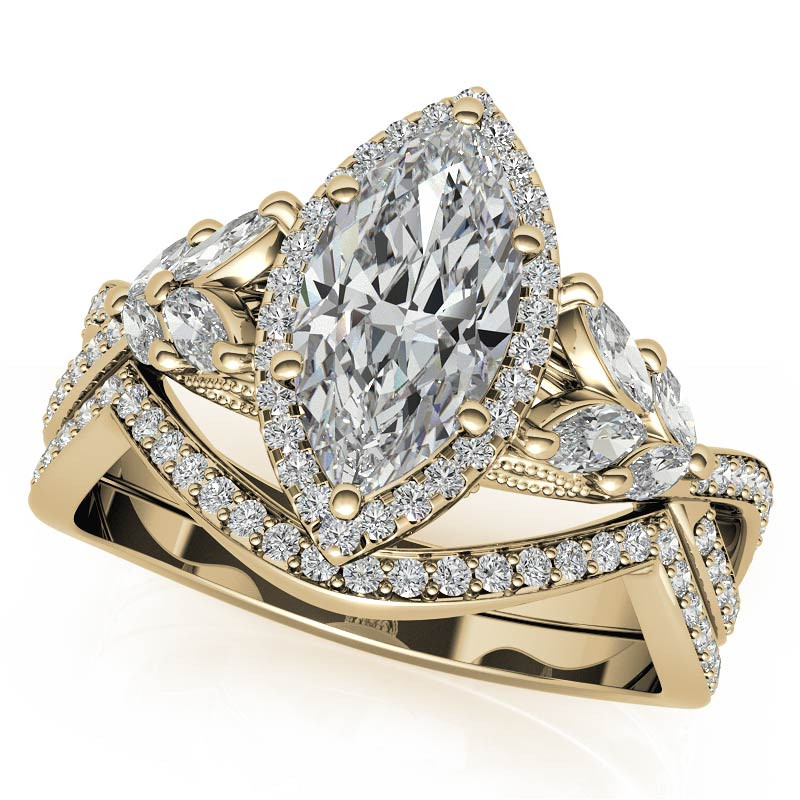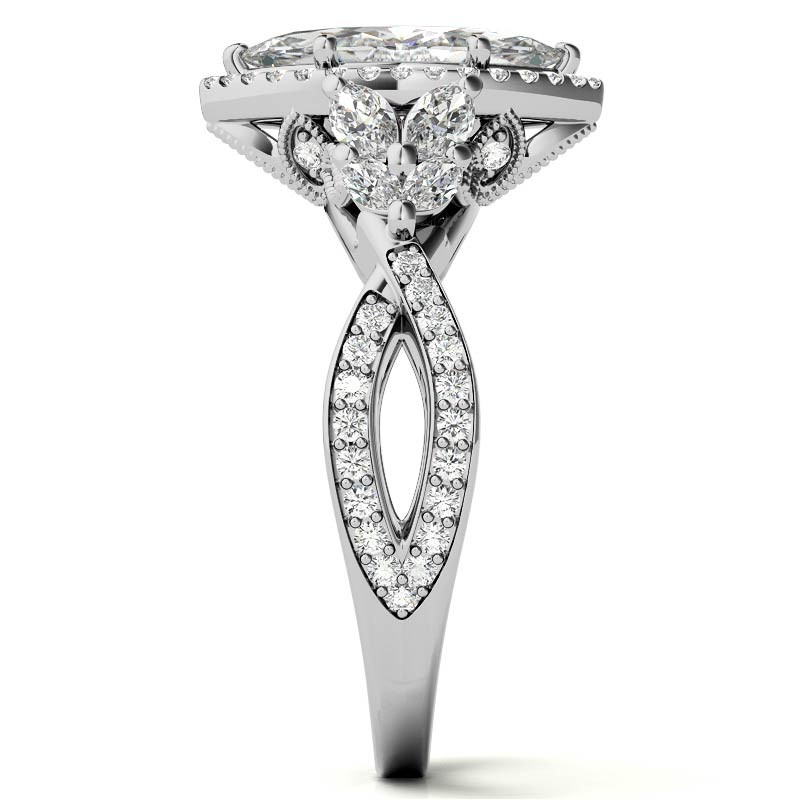 At the heart of this masterpiece lies a marquise cut lab grown diamond gemstone, chosen according to your desired size and quality. Admire its resplendent beauty, surrounded by a captivating halo of round melee accent stones that gracefully adorn the split portion of the band. Unveiling another layer of sophistication, delicate milgrain-detailed petal-shaped accents enhance the area beneath the center stone, infusing the design with a delightful floral motif.