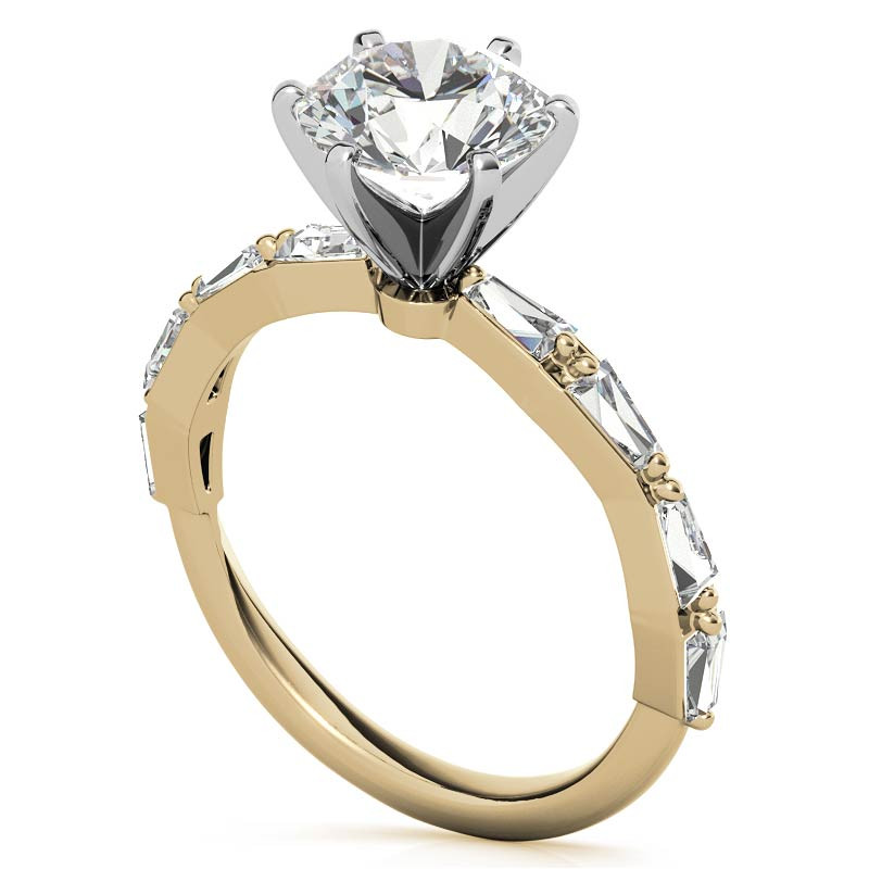 Experience elegance with our exquisite engagement ring, meticulously crafted to capture your heart. With a graceful tapered band design, this stunning piece showcases eight baguette cut diamond side stones, measuring 3.5x2.0x1.25mm each. Versatility lies at the core of this setting, offering a choice between a 4- or 6-prong configuration, perfectly accommodating any shape and size of lab grown diamond center stone from your preferred quality.
