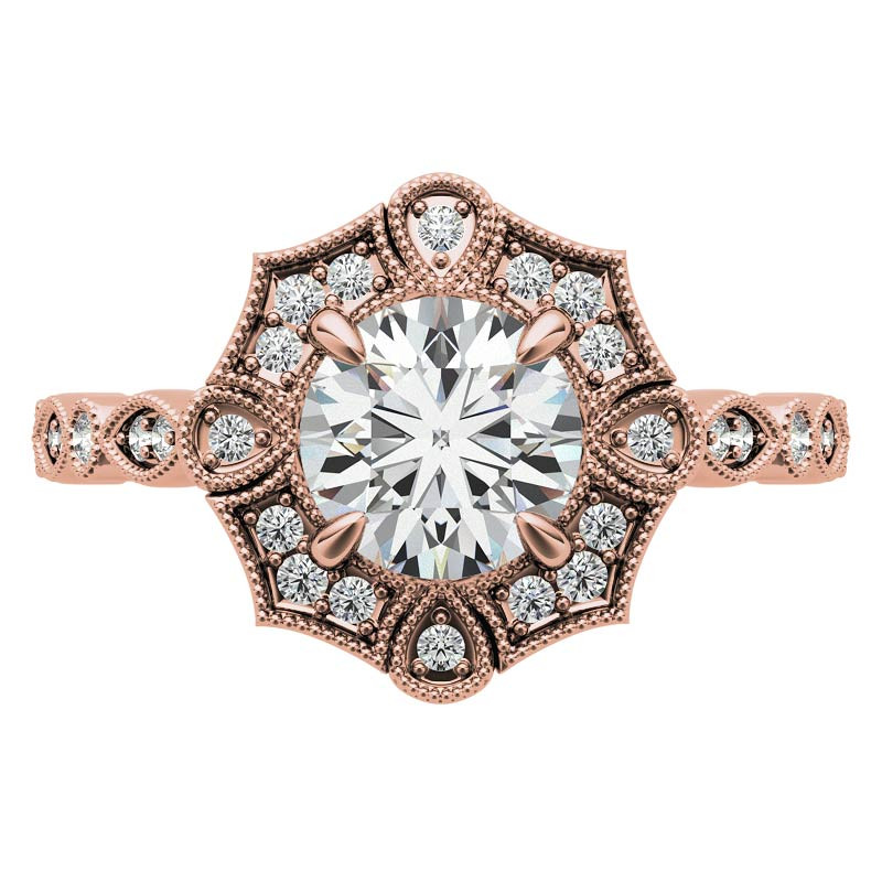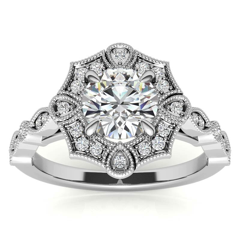 This beautiful lab grown diamond engagement ring features an antique scalloped halo design with a round cut colorless lab grown diamond center stone, 0.21ct of round colorless lab grown diamond side stones, and is available in 14k gold, 18k gold or platinum. An optional 0.14ct matching band is available. The band width for both rings is approximately 1.9mm.