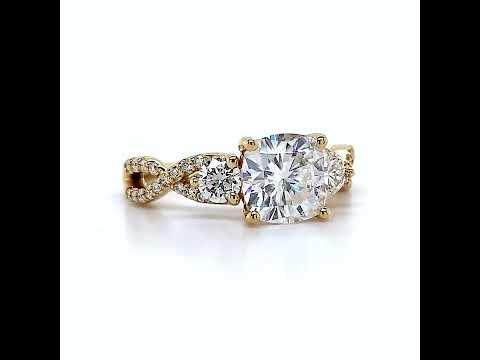 Embark on a journey through time with our exquisite engagement ring, exuding the charm of antique inspiration. This captivating piece showcases a magnificent three-stone design, where a round brilliant lab grown diamond center stone takes center stage, surrounded by two smaller round brilliant lab grown diamond side stones.