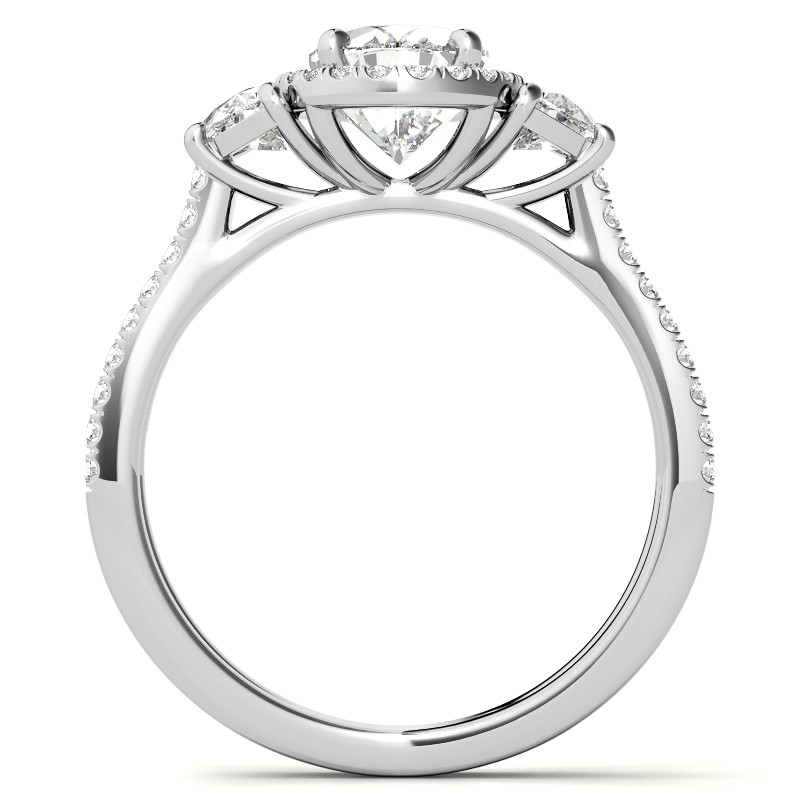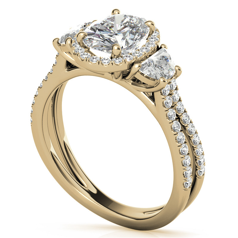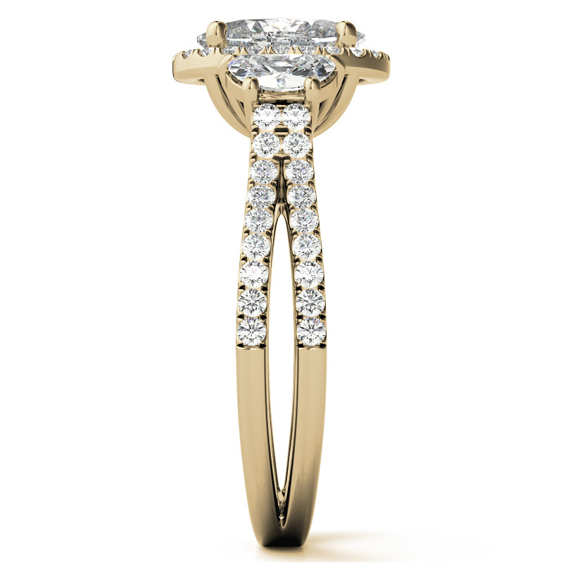 This beautiful lab grown diamond engagement ring features an oval and half-moon 3-stone halo design with a split shank setting, and 0.46ct - 0.50ct of round brilliant cut lab grown diamond accents in your choice of 14k gold, 18k gold or platinum. The half-moon side stones are 5x3mm each. The band width is approximately 2.3mm.