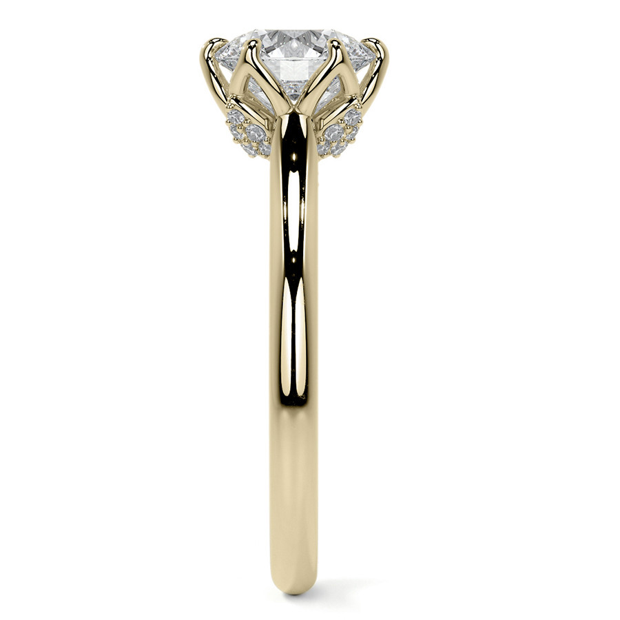 Crafted with the utmost care and precision, this ring boasts a stunning round brilliant lab grown diamond center stone, available in a variety of sizes to fit your personal style. The stone is secured by six claw-shaped prongs atop a gorgeous tulip-shaped setting, adorned with round pave set melee stones.