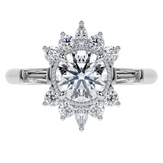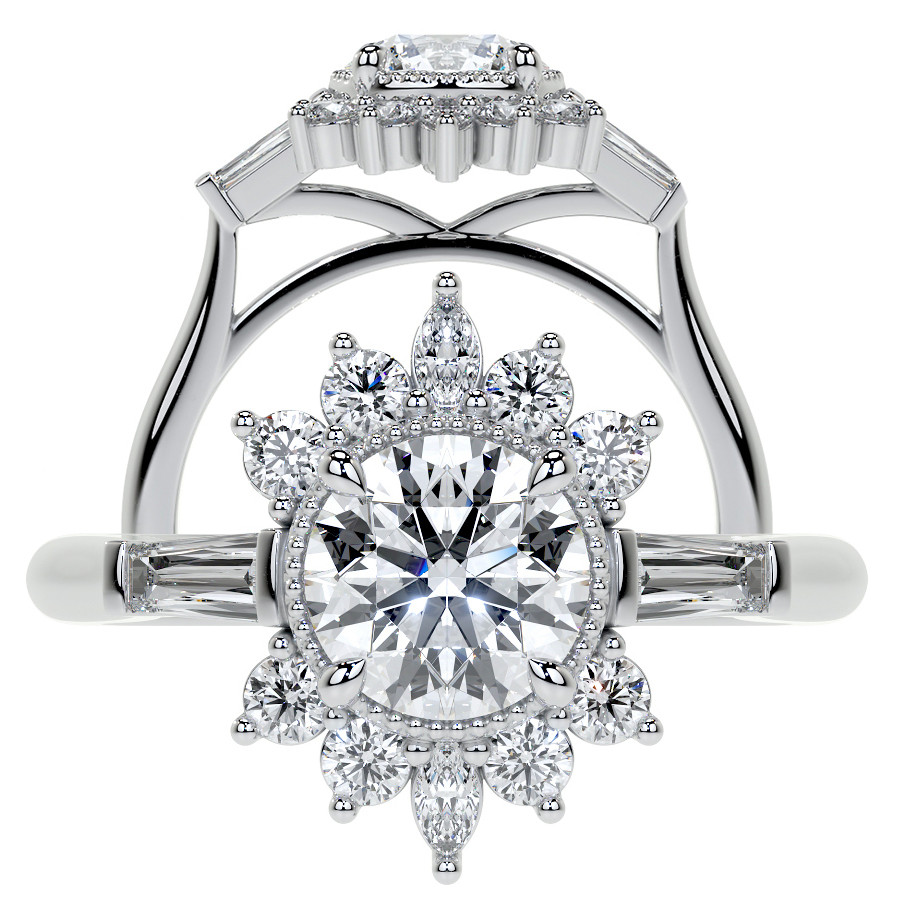 The center stone is a round brilliant lab grown diamond that can be customized to your desired size and quality. A delicate milgrain detailing encases the center stone, complementing the claw-shaped prongs that hold it securely in place. On either side of the center stone are two tapered baguette side stones, measuring 4x2x1.5mm each, set in a bar setting at the top of the cathedral. The remaining band design is plain, allowing the stunning visual of the halo to shine through.
