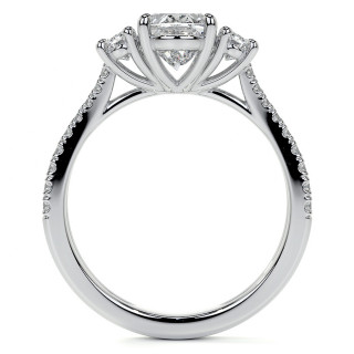 This exquisite cathedral engagement ring boasts an exceptional split shank band design leading up to a breathtaking three-stone display of basket set oval cut lab grown diamond gemstones. The center stone, available in the size and quality of your choice, is flanked by two 5x3mm/0.26ct oval cut side stones, each meticulously placed for maximum visual impact.