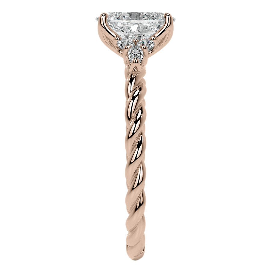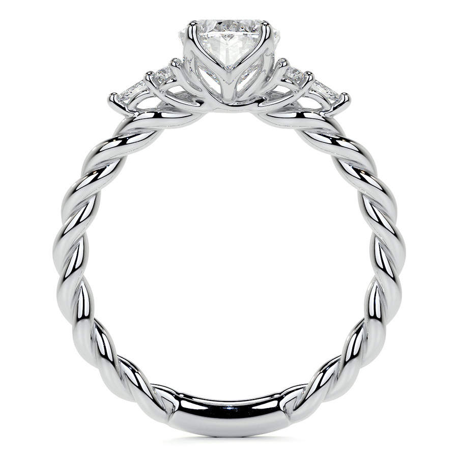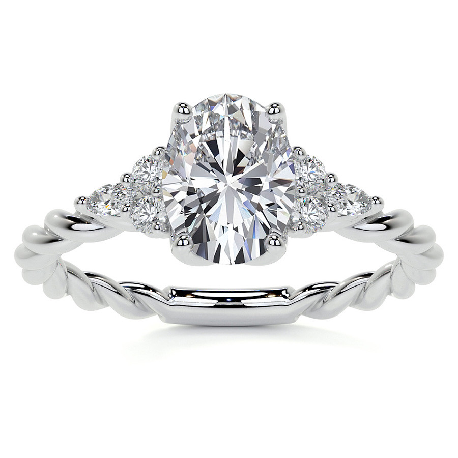 Experience the beauty of our unique engagement ring, featuring an exquisite plain band with a twisted rope design that adds a touch of artistic flair to your special moment. This stunning ring is crowned with an oval cut lab grown diamond center stone in the size and quality of your choosing, providing a personalized experience that perfectly captures your unique love story.