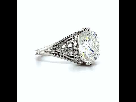 This beautiful antique reproduction filigree ring is designed with an 9x7mm, 2.5ct emerald cut lab grown diamond center stone.
