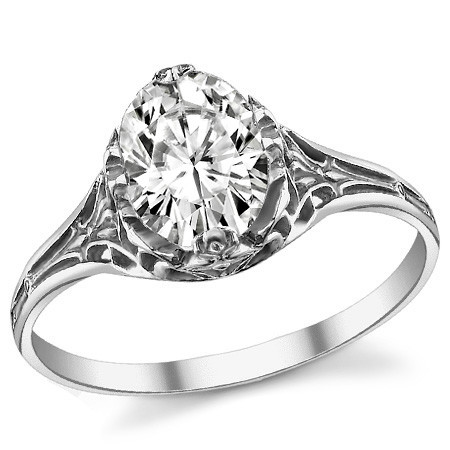 This beautiful antique reproduction filigree ring is designed with an 8x6mm, 1.5ct oval cut lab grown diamond center stone.