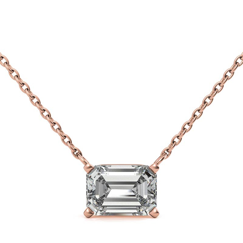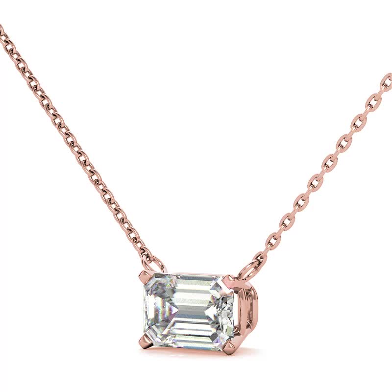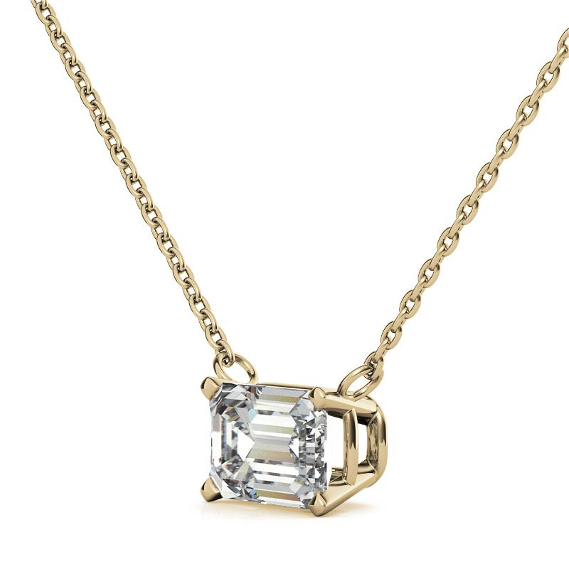 This beautiful lab grown diamond pendant features a 4-prong floating solitaire design, set with an emerald or radiant cut colorless lab grown diamond gemstone in 14k white or yellow gold.
