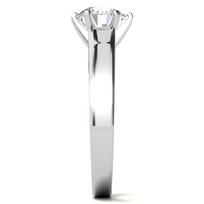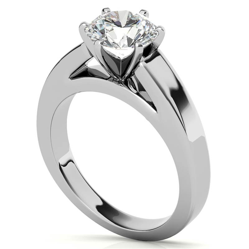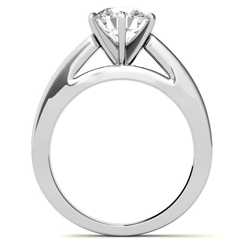 This beautiful lab grown diamond solitaire ring features a cathedral flat band design, set in 14k gold, 18k gold or platinum. It is available in three different widths with an optional matching band.