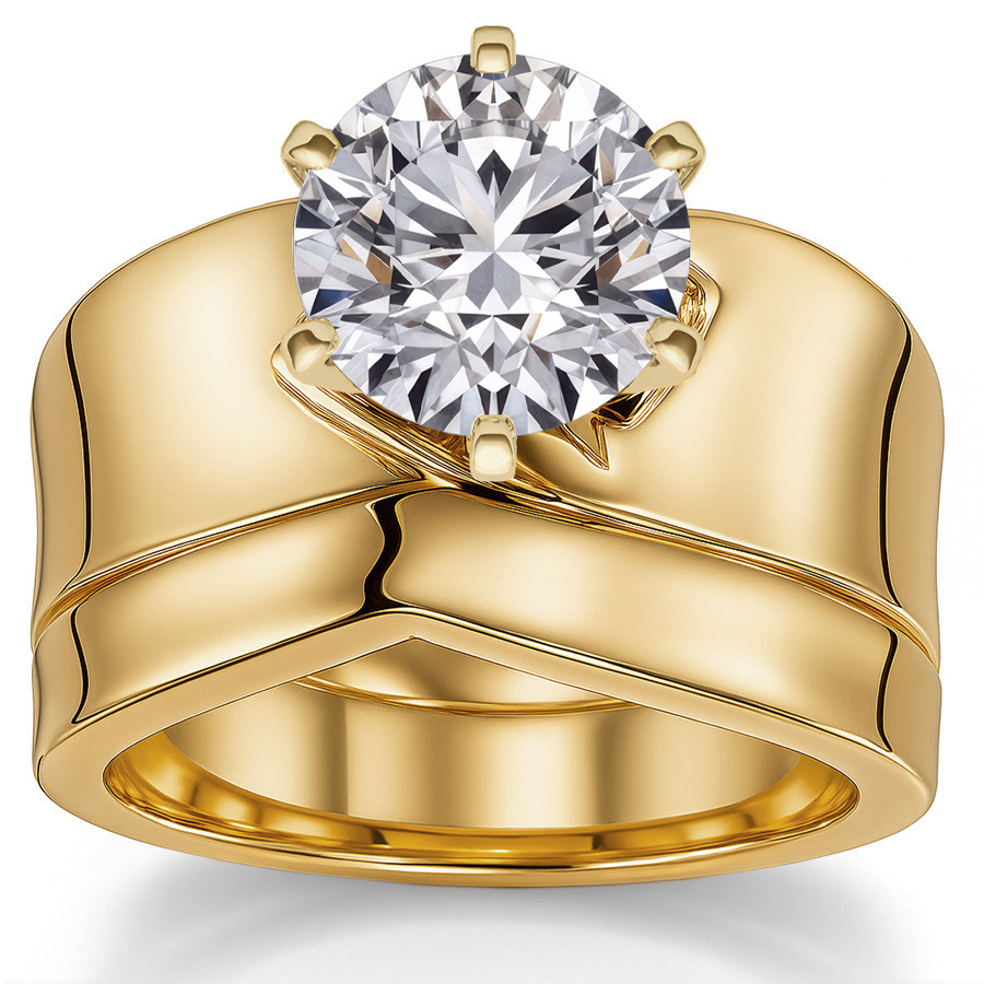 Beautiful wide band solitaire design. Available in 14k white or yellow gold. Choose your center stone using the drop down menu below. It can be set with a 4 or 6-prong center stone.