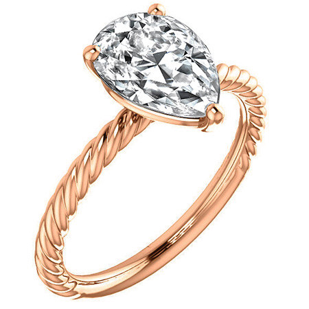 This solitaire ring features a women, rope-like band, a pear cut colorless lab grown diamond center stone, and is cast in 14k gold, 18k gold or platinum.
