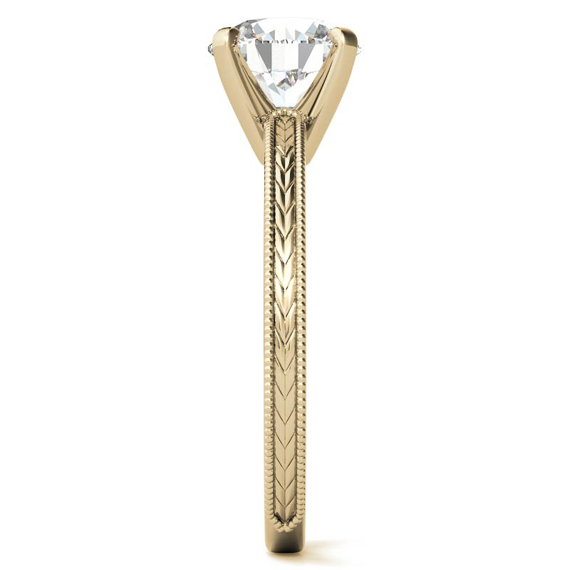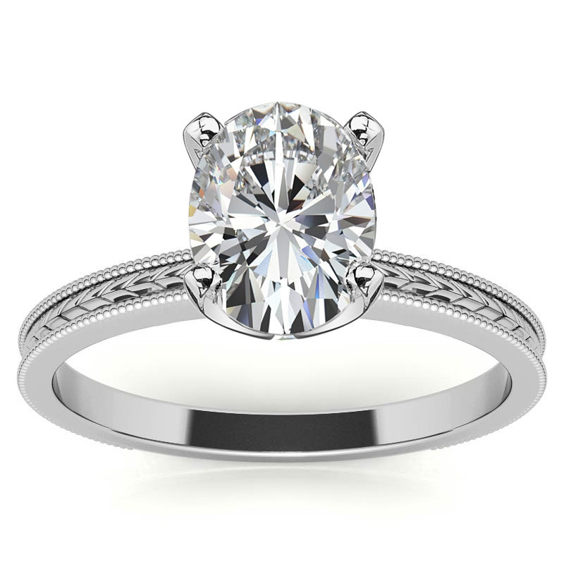 This beautiful lab grown diamond solitaire ring features an etched design with milgrain accents and your choice of lab grown diamond shape center stone, cast in 14k gold, 18k gold or platinum.