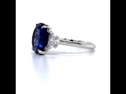 At the heart of this remarkable ring lies an oval cut lab grown diamond gemstone, carefully selected to match your desired size and quality. Nestled within a graceful tulip-shaped setting, the center stone is secured by six claw-shaped prongs, ensuring its brilliance and radiance take center stage.