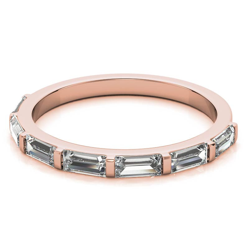This stackable band has seven 4mm x 2mm baguette lab grown diamond stones (0.77tcw). Set in your choice of 14k gold, 18k gold or platinum. The band measures 2.0mm wide and about 2mm high.