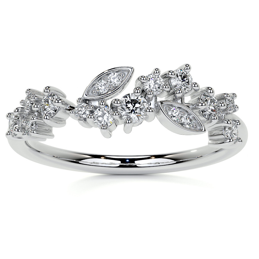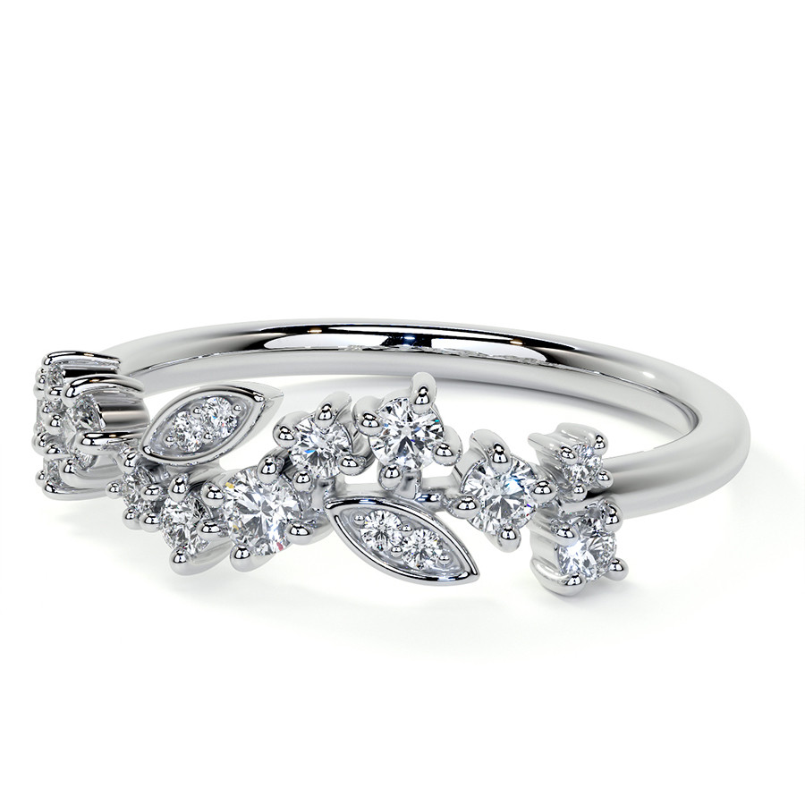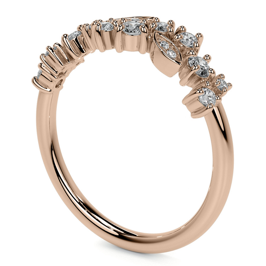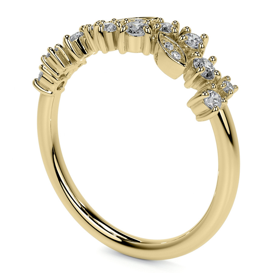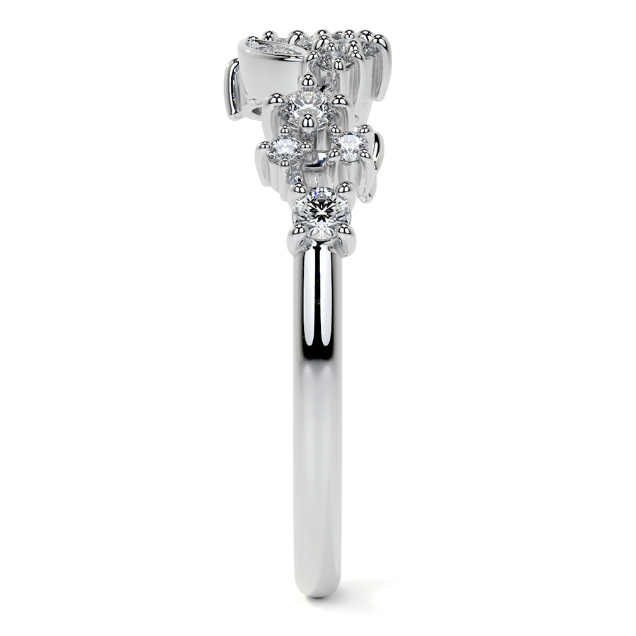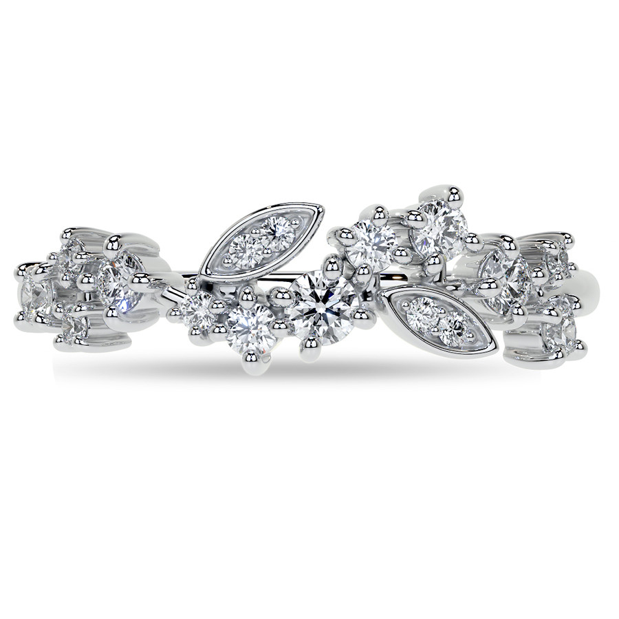 This beautiful lab grown diamond stackable band features an unique cluster style design with round and marquise shaped sections, 0.30ct of round colorless lab grown diamond side stones, and is cast in your choice of 14k gold, 18k gold or platinum. The band width is approximately 1.5mm.