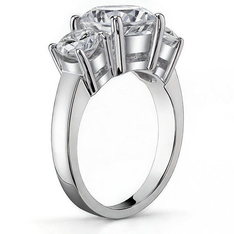 This specific listing boasts a stunning 9.5mm/3.5ct round brilliant lab grown diamond center stone and two accentuating 6.5mm/1ct round brilliant lab grown diamond side stones, resulting in a total carat weight of 5.5ct. The band width is approximately 3.7mm at the base, tapering out to 4.2mm at its widest point.