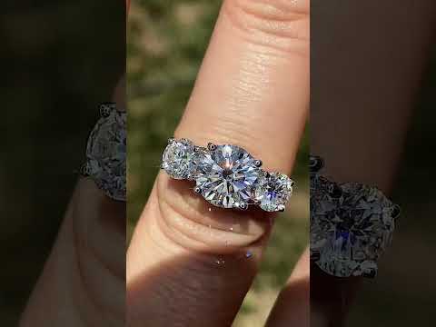 Within this extraordinary collection, you'll discover a variety of combinations, ensuring the perfect trio that resonates with your unique taste and style. This particular ring is adorned with a striking 9mm/3.0ct round center stone, elegantly complemented by two 6mm/0.75ct side stones, culminating in an impressive total carat weight of 4.5ctw.