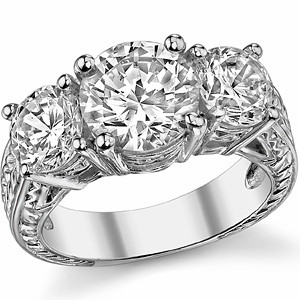This beautiful antique style three stone lab grown diamond ring features a 3.0ct (9mm) round brilliant lab grown diamond center and two 6.5mm (1.0ct each) round brilliant lab grown diamond side stones for a total of 5.0 ct, set in 14k gold, 18k gold or platinum.