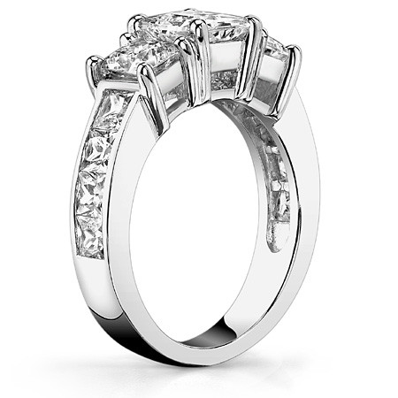 This beautiful three stone lab grown diamond ring features a 1.7ct (6.5mm) princess cut lab grown diamond center, two 4mm (0.4ct each) and twelve 2mm princess cut lab grown diamond side stones for a total of 3.2 ct, set in 14k gold, 18k gold or platinum.