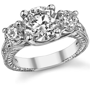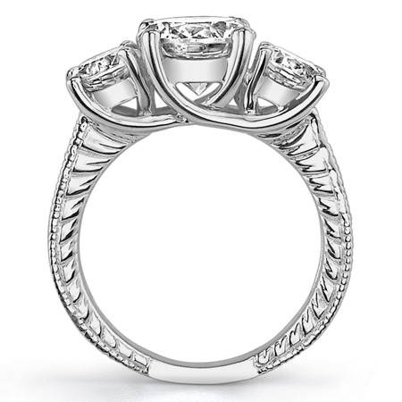Featuring Three Stone, Antique, Etched, Trellis and Milgrain from our Engagement Rings collection. Model #thr218c is available in 1 brilliant center stone options, 2 fine sidestone options, and your choice of 5 eco-friendly precious metals.