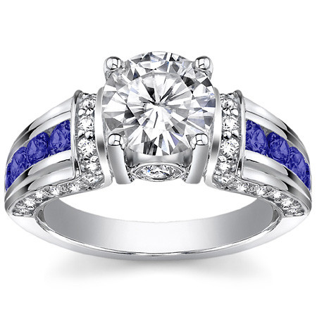 This beautiful lab grown diamond wedding set features a round brilliant lab grown diamond center stone, 1.8 carat of cultured blue sapphire / ruby side stones, and round brilliant lab grown diamond side stones, and is set in 14k white gold, 14k yellow gold, or platinum.